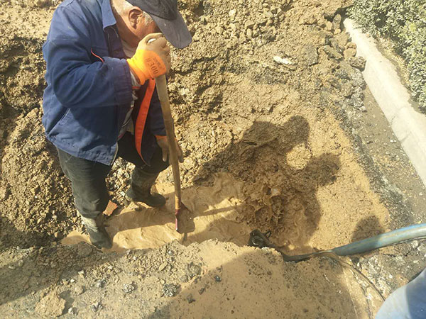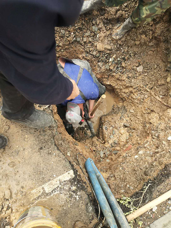 方案確定后,搶修人員立即行動(dòng)起來,現(xiàn)場(chǎng)做好安全圍擋。為保障居民在用水高峰期的正常用水,現(xiàn)場(chǎng)指揮人員請(qǐng)示領(lǐng)導(dǎo),定于4日晚上23點(diǎn)至5日凌晨5點(diǎn)關(guān)閉閥門停水施工,白天先進(jìn)行挖基坑等準(zhǔn)備工作。由于此處管線錯(cuò)綜復(fù)雜,為避免損壞光纖、燃?xì)獾绕渌艿烙绊懢用裆?,施工人員放棄使用挖掘機(jī),而是采用人工開挖基坑。同時(shí),搶修隊(duì)啟動(dòng)了三臺(tái)抽水泵,邊抽水邊挖基坑。經(jīng)過10個(gè)多小時(shí)的持續(xù)挖掘,終于把漏水點(diǎn)所在的管道全部挖出。經(jīng)再次檢查,確定為鋼管銹蝕導(dǎo)致的漏水。此時(shí)已值深夜,居民大多進(jìn)入了夢(mèng)鄉(xiāng)。張班長(zhǎng)冒著涼風(fēng)深入環(huán)境惡劣的閥門井,關(guān)閉了供水閥門,準(zhǔn)備實(shí)施破損管道維修。